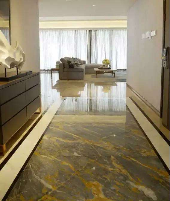 玄关(地面石材:黄金殿堂搭配雅士白及皇室金啡波打)